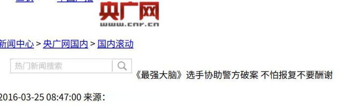 《〈最广宽脑〉选手协助警方破案 不怕挫折不要酬金》(央广网)
