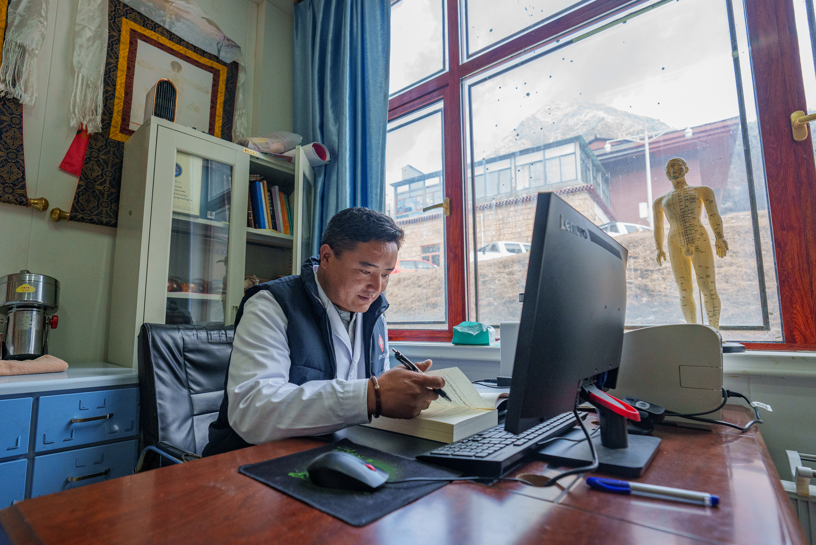 2月5日,玉麦乡卫生院副院长次旦米久在办公室研读藏医册本。新华社记者 丁增尼达 摄