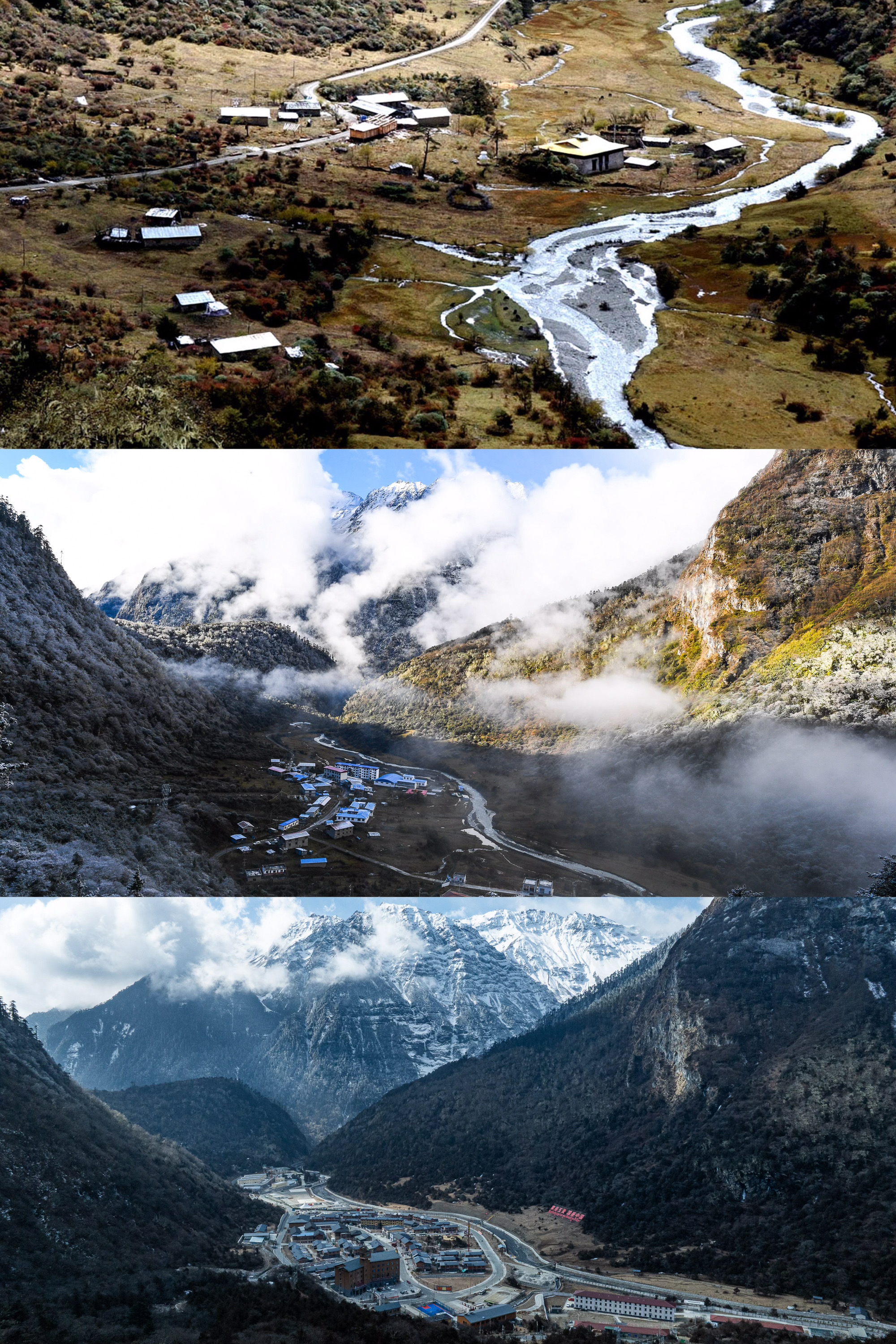 拼版相片:上图是2003年10月26日拍摄的玉麦乡(新华社记者 索朗罗布 摄);中图是2017年10月31日拍摄的玉麦乡(新华社记者 普布扎西 摄);下图是2026年2月5日拍摄的玉麦乡(无东谈主机相片,新华社记者 丁增尼达 摄)。