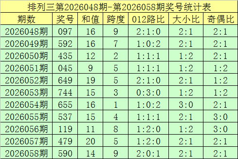 开奖总结:摆设三第2026058期奖号开出:590,组选类型:组六,大小比为2:1,奇偶比为2:1,和值为14,跨度为9。