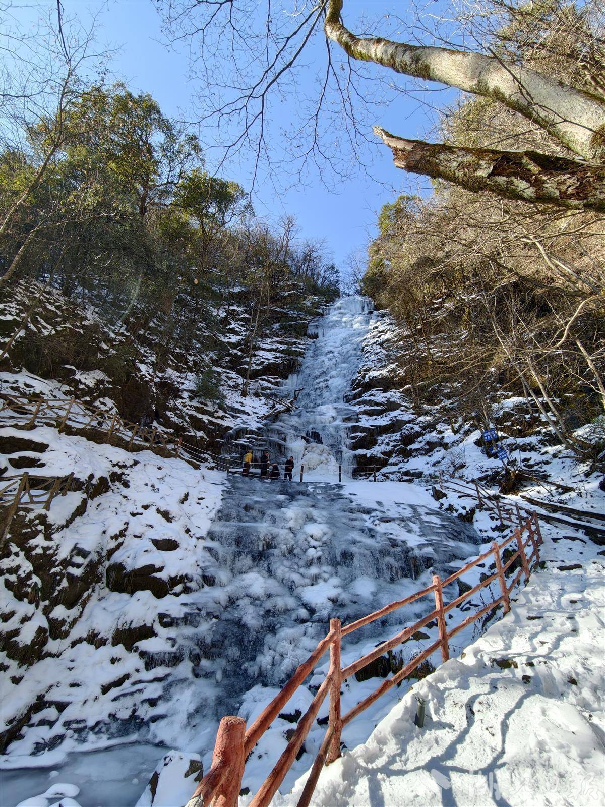站在百米落差的冰瀑下仰望,犹如白净的锦缎顺着山崖铺展而下,藏在冰层下的潺潺细水若有若无。阳光穿透山林照射在冰瀑上,重重叠叠的冰晶能干着淡蓝色微光。