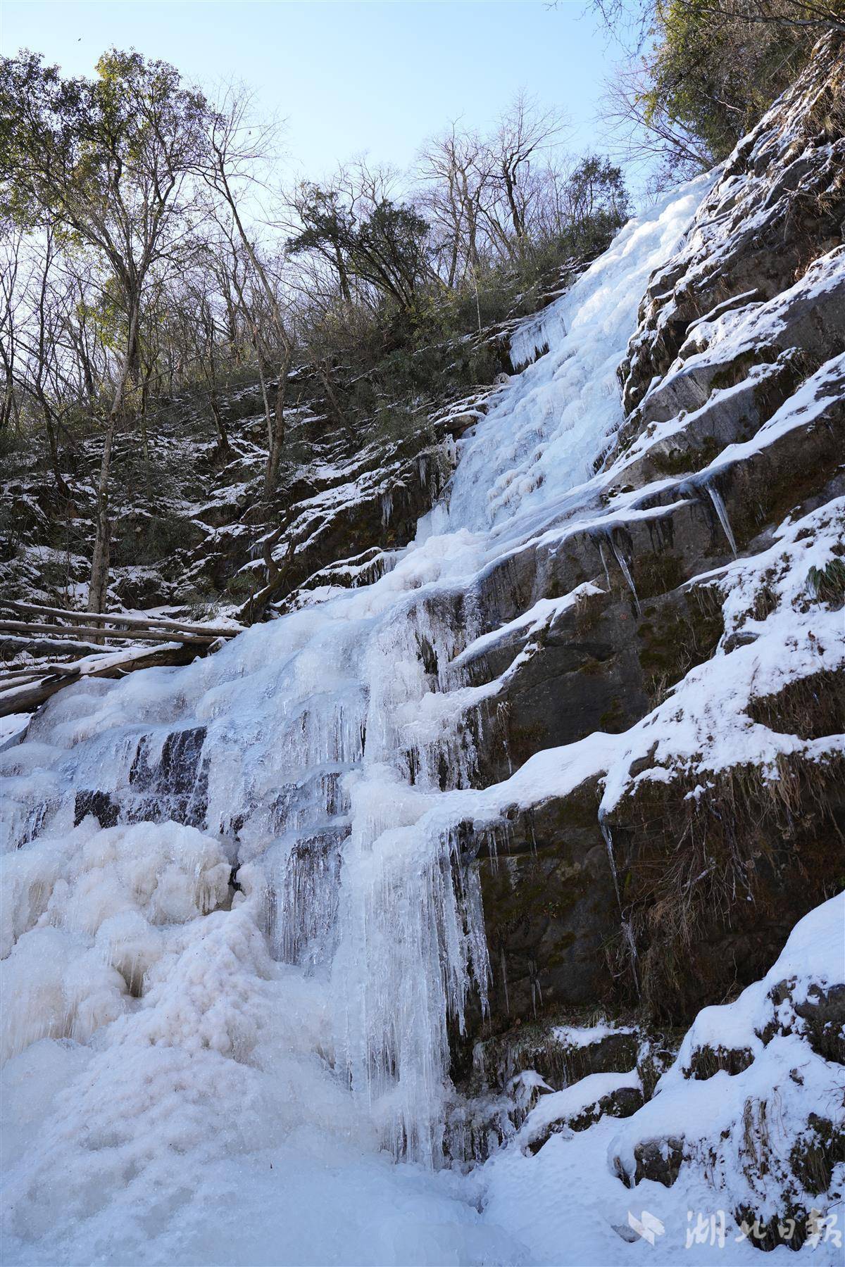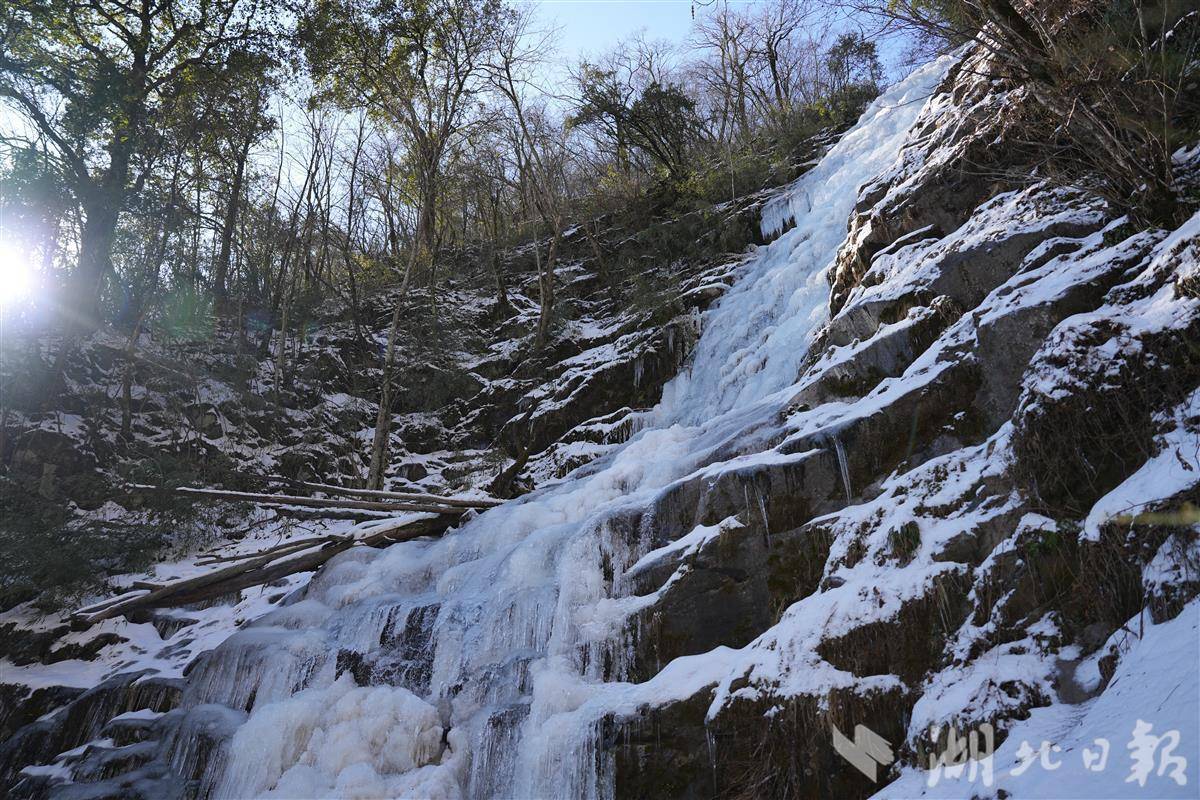 1月7日,海拔1200米的竹溪县营盘山生态旅游景区,气温零下8℃。湖北日报全媒记者穿上“冰爪”防滑鞋套,耗时约30分钟,登上了海拔1500米的冰瀑场所地。一起上,攀山步说念被冰雪消失,山间溪流逐渐成冰。