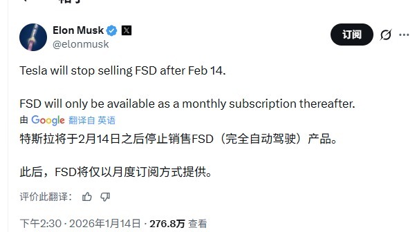 凤凰网科技讯 1月14日,特斯拉CEO马斯克在顶住媒体平台X发帖默示,特斯拉将在2月14日后罢手销售FSD。尔后,FSD将仅以月度订阅的样式提供。