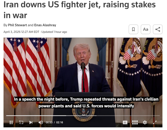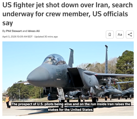 △路透社报说念,好意思国战机在伊朗被击落,搜救责任现在正在进行中。