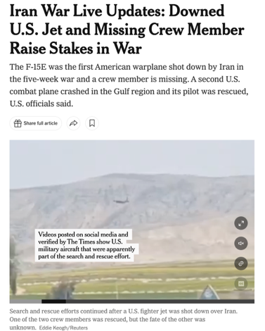 △《纽约时报》报说念,好意思军战机在伊朗被击落,这是五周战争中首架被击落的好意思军战机。
