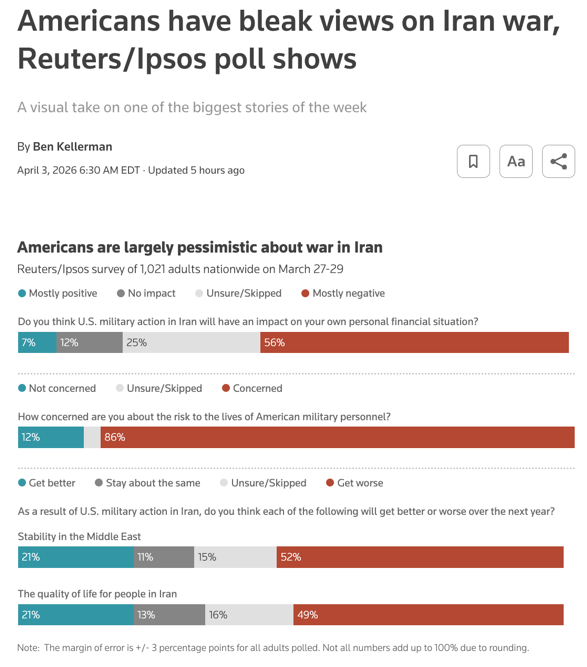 △路透社4月3日发布最新民调,好意思国巨匠渊博对伊朗战争捏悲不雅作风。