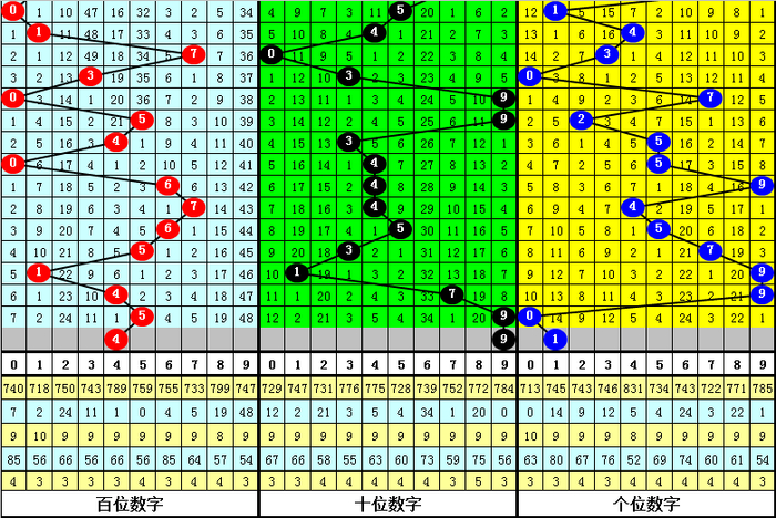 大中小分析:在组选0-9号码散布图中,前10期小 号(0-2区段)出现5枚奖号,中号(3-6区段)出现17枚奖号,大号(7-9区段)出现8枚奖号,上期大中小区间分辩出现1枚奖号,本期瞻望大中小区域各出1枚奖号。