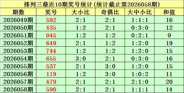 上期总结:罗列三第2026058期奖号为:590。奖号类型:组六,和值:14,奇偶比:2:1,跨度:9,大小比:2:1。